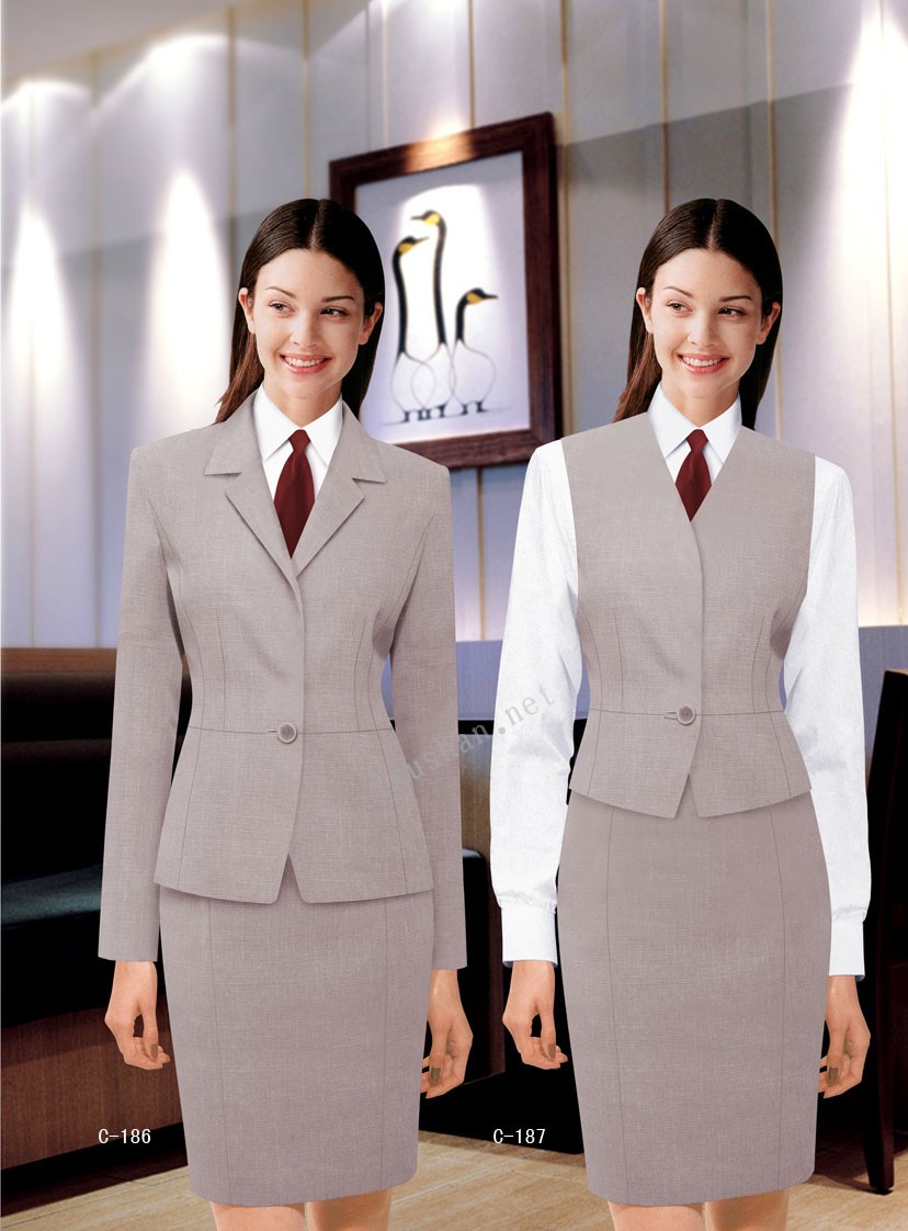 行政職業裝(5張)市商業行為和商業活動中最為流行的一種服飾,它是兼具職業裝與時裝特 點的一類服裝。它不像職業制服那樣有很明確的穿著規定與要求,但需有一定得穿著場合,特別是它還有著很明顯的流行性,因此,它具有很濃厚的商業屬性,這類服裝十分追求品位與潮流,用料上更加考究,造型上強調簡潔與高雅,色彩追求合適的搭配與協調,總體上注重體現穿著者的身份、文化修養及社會地位。   適用于金融、保險、通信、國家機關、文物、交通等各企業事業單位的窗口部門及福利單位,主要款式喂西裝或變形西裝,主要面料為各種含毛的貢絲錦、吡嘰、新豐呢、板絲呢、金爽呢、雙面呢等。