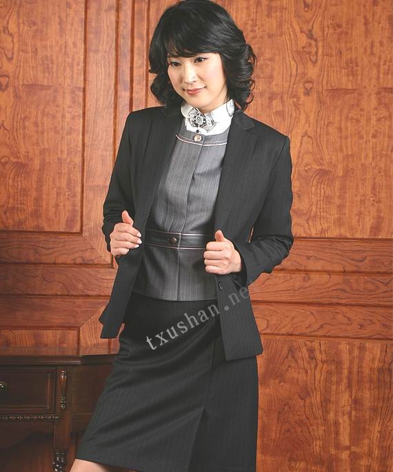 行政職業(yè)裝(5張)市商業(yè)行為和商業(yè)活動(dòng)中最為流行的一種服飾,它是兼具職業(yè)裝與時(shí)裝特 點(diǎn)的一類服裝。它不像職業(yè)制服那樣有很明確的穿著規(guī)定與要求,但需有一定得穿著場(chǎng)合,特別是它還有著很明顯的流行性,因此,它具有很濃厚的商業(yè)屬性,這類服裝十分追求品位與潮流,用料上更加考究,造型上強(qiáng)調(diào)簡(jiǎn)潔與高雅,色彩追求合適的搭配與協(xié)調(diào),總體上注重體現(xiàn)穿著者的身份、文化修養(yǎng)及社會(huì)地位。   適用于金融、保險(xiǎn)、通信、國(guó)家機(jī)關(guān)、文物、交通等各企業(yè)事業(yè)單位的窗口部門及福利單位,主要款式喂西裝或變形西裝,主要面料為各種含毛的貢絲錦、吡嘰、新豐呢、板絲呢、金爽呢、雙面呢等。